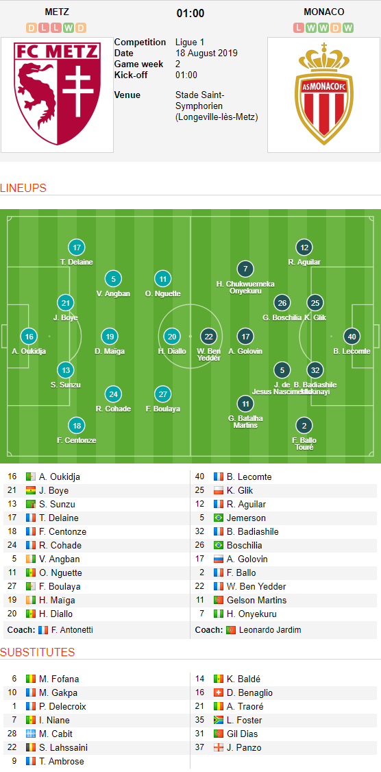 AEGoal.net cập nhật chính xác ĐỘI HÌNH RA SÂN trận Metz vs Monaco diễn ra lúc 01h00 ngày 18/8 trong khuôn khổ Vòng 2 - VĐQG Pháp.
