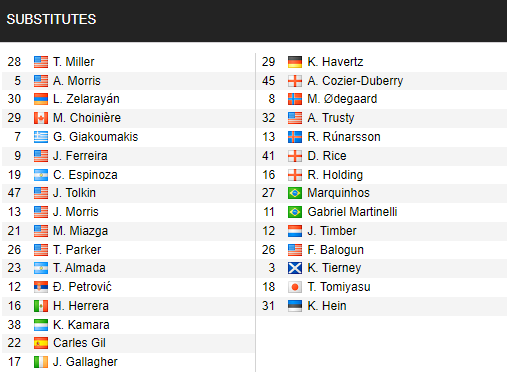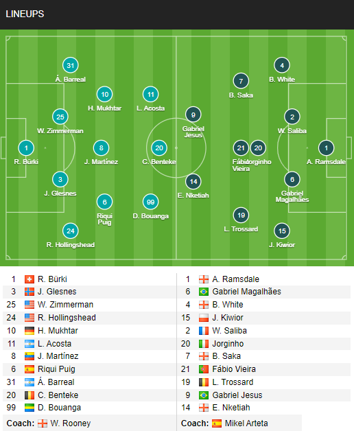Arsenal: Ramsdale; Timber, Saliba, Gabriel, Tierney; Jorginho, Rice, Havertz; Saka, Jesus, Martinelli