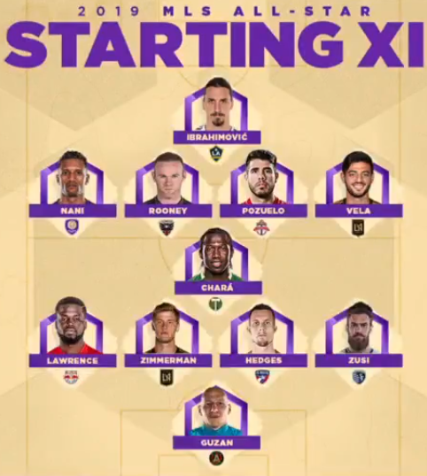 MLS All-Stars (4-4-2): Guzan - Lawrence, Schweinsteiger, Gonzalez Pirez, Zimmerman - Dos Santos, Moralez, Lodeiro, Carlos Vela - J. Martinez, Ibrahimovic