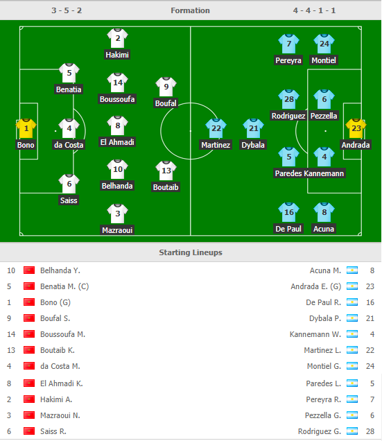 Argentina: Armani; Montiel, Foyth, Mercado, Lisando Martinez, Tagliafico; Lo Celso, Paredes; Dybala, Pereyra, Lautaro Martinez.