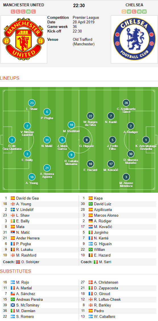 AEGoal.net cập nhật chính xác ĐỘI HÌNH RA SÂN trận MU vs Chelsea diễn ra lúc 22h30 ngày 28/4 trong khuôn khổ vòng 36 Ngoại hạng Anh