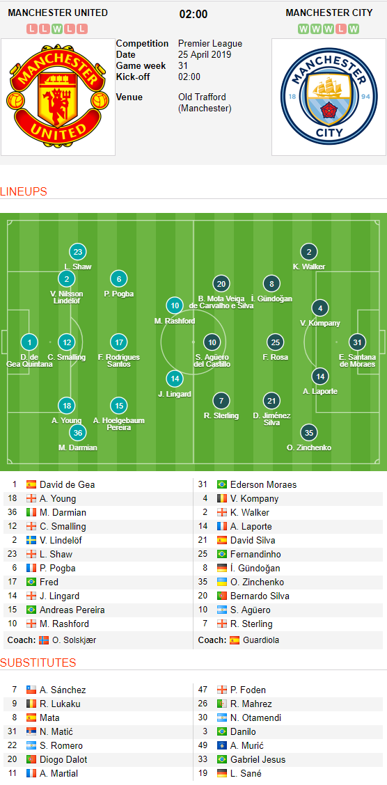 AEGoal.net cập nhật chính xác ĐỘI HÌNH RA SÂN trận MU vs Man City diễn ra lúc 2h00 ngày 25/4 trong khuôn khổ đá bù vòng 31 giải Ngoại hạng Anh