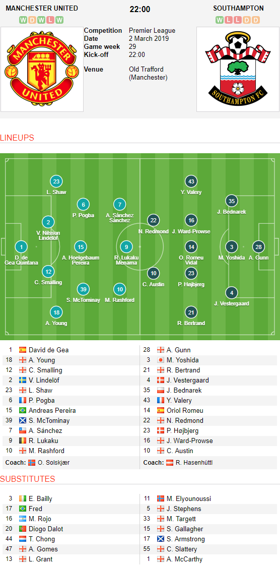 AEGoal.net cập nhật chính xác ĐỘI HÌNH RA SÂN trận MU vs Southampton diễn ra lúc 22h00 ngày 02/3 trong khuôn khổ Vòng 29 giải Ngoại hạng Anh.