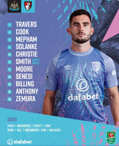 Bournemouth: Travers; Smith, Mepham, Senesi, Zemura; Tavernier, Cook, Lerma, Billing; Moore, Solanke.