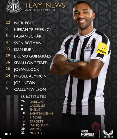 Newcastle: Pope; Trippier, Lascelles, Botman, Targett; Shelvey, Longstaff, Willock; Almiron, Wood, Saint-Maximin.