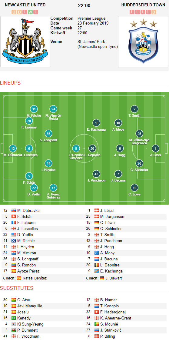 AEGoal.net cập nhật chính xác ĐỘI HÌNH RA SÂN trận Newcastle vs Huddersfield diễn ra lúc 22h00 ngày 23/2 trong khuôn khổ Vòng 27 - Ngoại Hạng Anh
