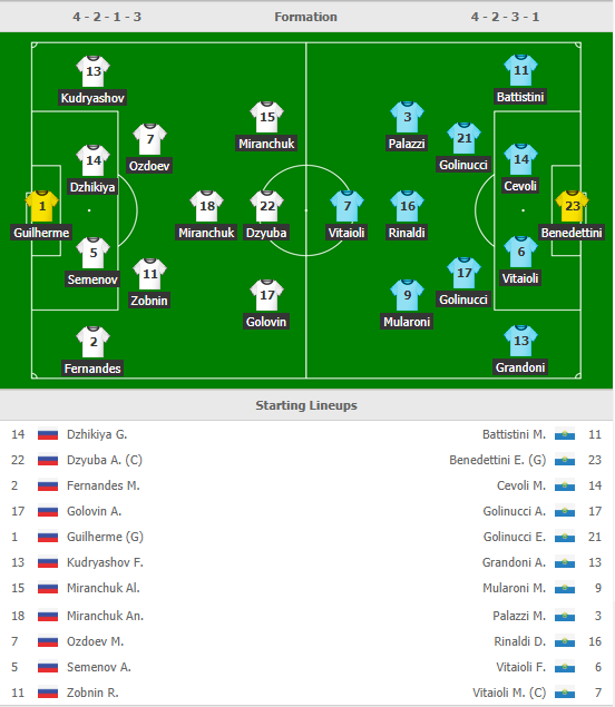 * Nga (4-2-3-1): Guilherme; Fernandes, Semenov, Dzhikiya, Kudryashov; Ozdoev, Golovin; Ionov, Akhmetov, Miranchuk; Dzyuba.