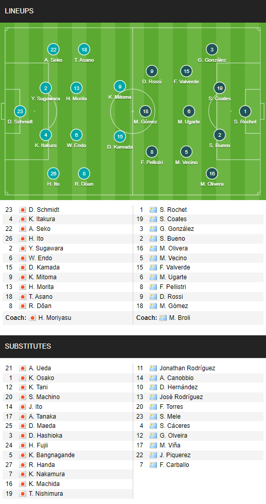 Nhật Bản (4-3-3): Osako; Itakura, Ito, Handa, Seko; Endo, Asano, Morita; Mitoma, Kubo, Tanaka