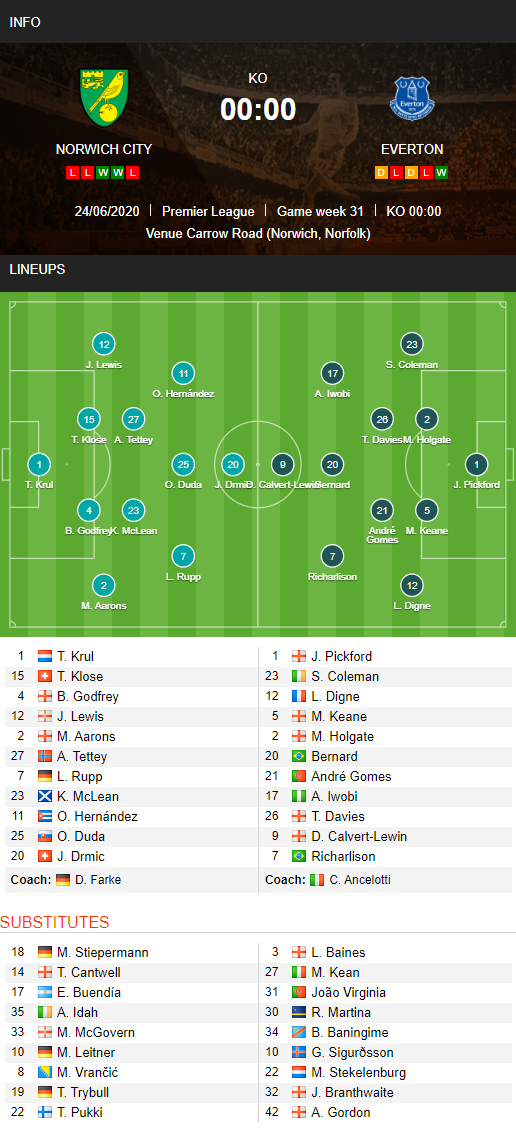 AEGoal.net cập nhật chính xác ĐỘI HÌNH RA SÂN trận Norwich vs Everton diễn ra lúc 00h00 ngày 25/6 trong khuôn khổ giải Ngoại hạng Anh.