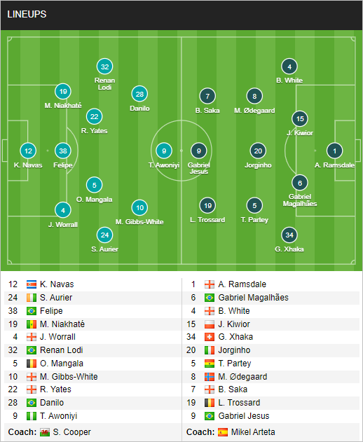 Nottingham (4-3-3): Navas, Aurier, Monteiro, Niakhate, Renan Lodi, Mangala, Ryan Yates, Danilo, Brennan Johnson, Awoniyi, Gibbs-White.