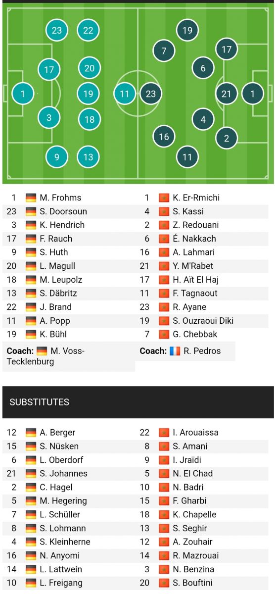 Nữ Morocco (4-4-1-1): Er-Rmichi; Redouani, El Haj, Mrabet, Seghir; Ouzraoui, Amani, Nakkach, Tagnaout; Chebbak; Ayane