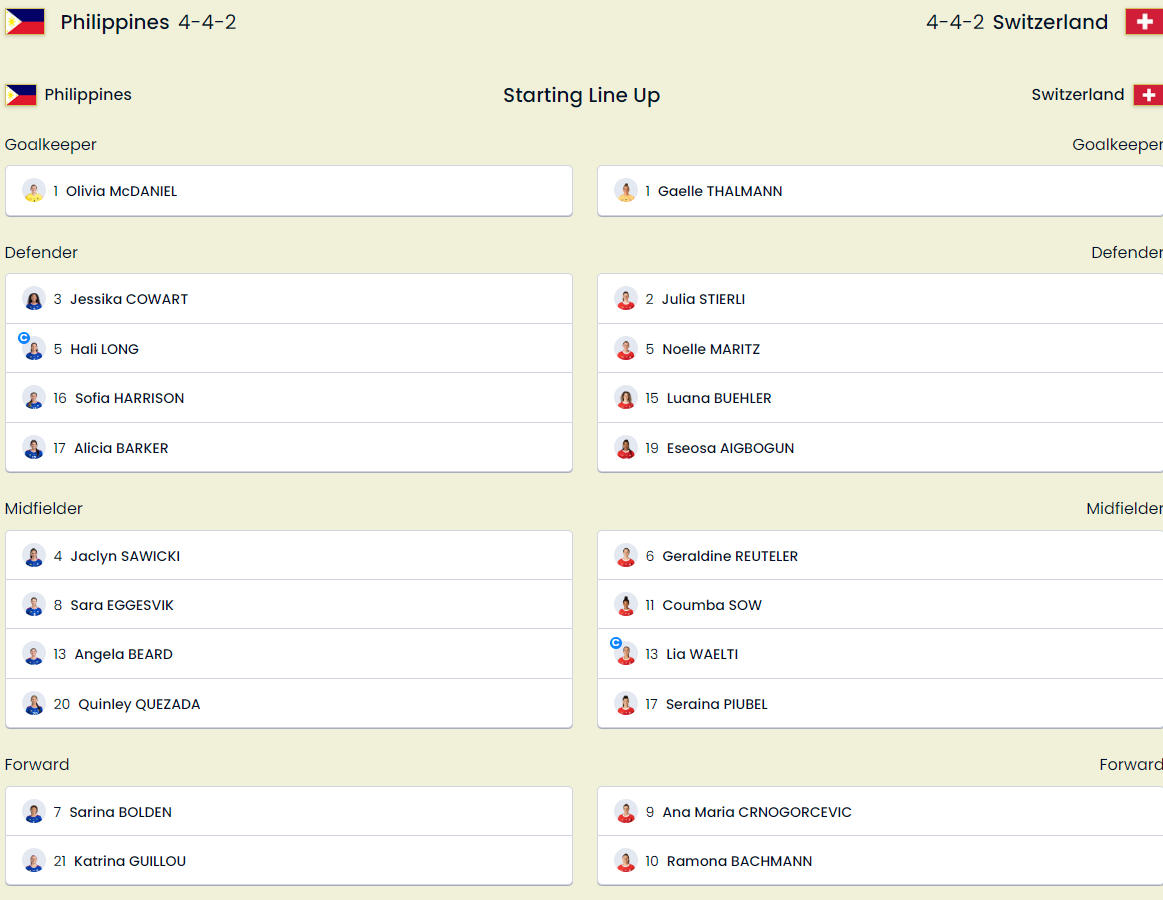 AEGoal cập nhật chính xác đội hình ra sân trận Nữ Philippines vs Nữ Thụy Sĩ diễn ra lúc 12h00 ngày 21/7 trong khuôn khổ World Cup Nữ 2023.