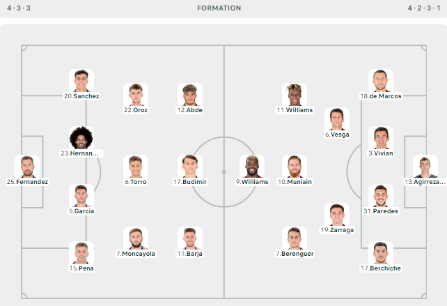 - Bilbao: Simon; De Marcos, Vivian, Paredes, Berchiche; Zarraga; N.Williams, Sancet, Muniain, Berenguer; I.Williams.