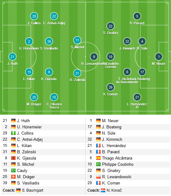 Bayern: Neuer (c) - Pavard, Sule, Boateng, Hernandez - Kimmich, Thiago - Gnabry, Coutinho, Coman – Lewandowski