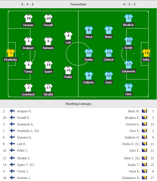 AEGoal.net cập nhật chính xác ĐỘI HÌNH RA SÂN trận Phần Lan vs Bosnia diễn ra lúc 23h00 ngày 08/6 trong khuôn khổ vòng loại EURO 2020.