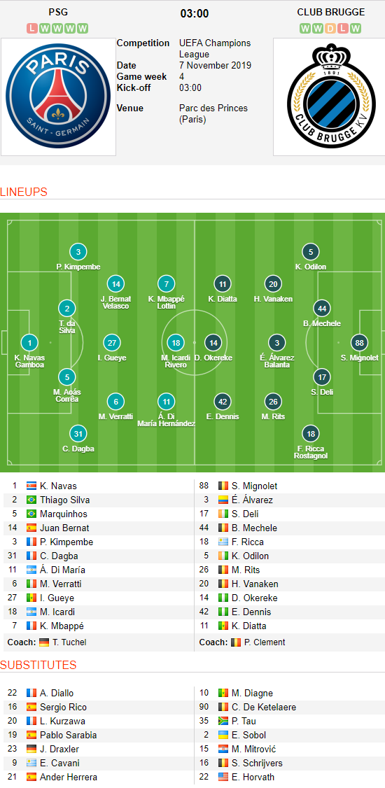 AEGoal.net cập nhật chính xác ĐỘI HÌNH RA SÂN trận PSG vs Club Brugge diễn ra lúc 03h00 ngày 07/11 trong khuôn khổ vòng bảng Cúp C1 châu Âu - UEFA Champions League.