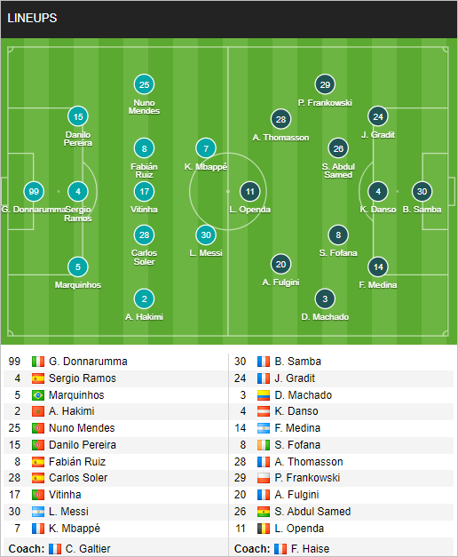 PSG (3-5-2): Donnarumma; Marquinhos, Ramos, Danilo; Hakimi, Vitinha, Ruiz, Soler, Nuno Mendes; Messi, Mbappe.
