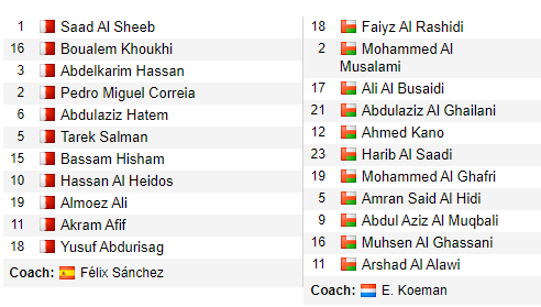 * Oman: Yahyaei, Ghassani, Saleh, Kano, Saadi, Yahmadi, Busaidi, Musalami, Braiki, Suhail, Rushaidi.