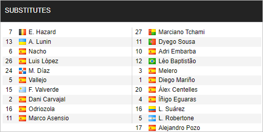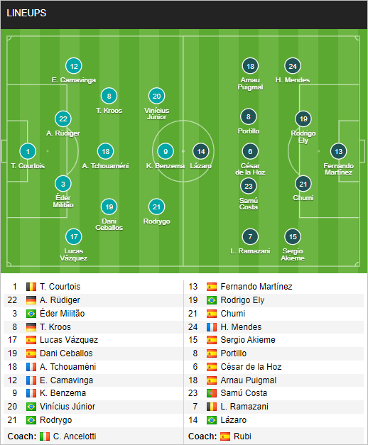 - Real Madrid: David Alaba, Karim Benzema, Thibaut Courtois, Eden Hazard và Ferland Mendy vắng mặt vì chấn thương.