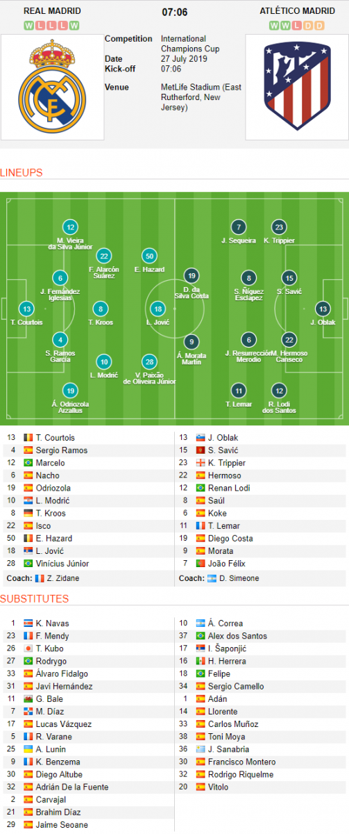 ĐỘI HÌNH RA SÂN trận Real Madrid vs Atletico Madrid, 06h30 ngày 27/7: ICC 2019
