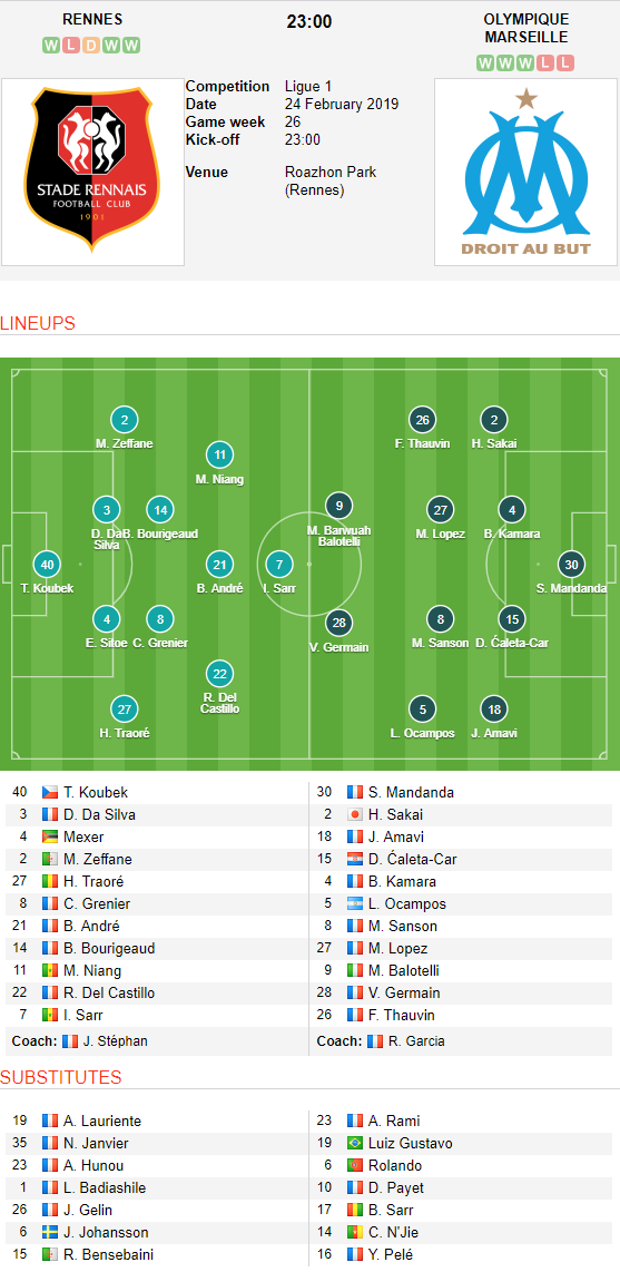 AEGoal.net cập nhật chính xác ĐỘI HÌNH RA SÂN trận Rennes vs Marseille diễn ra lúc 23h00 ngày 24/02 trong khuôn khổ vòng 26 giải VĐQG Pháp.