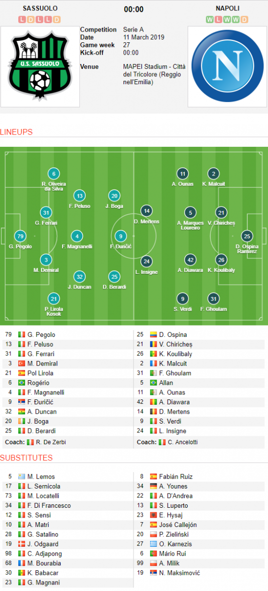 AEGoal.net cập nhật chính xác ĐỘI HÌNH RA SÂN trận Sassuolo vs Napoli diễn ra lúc 0h00 ngày 11/03 trong khuôn khổ vòng 27 giải VĐQG Italia.