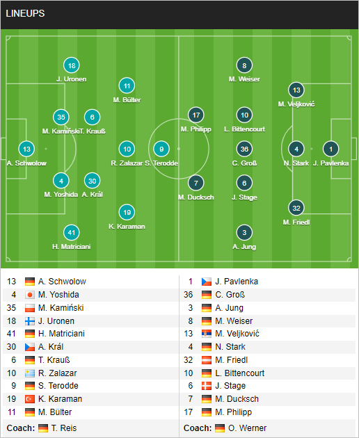 Bremen: Pavlenka; Pieper, Stark, Friedl; Stage, Gruev, Gross, Schmidt, Jung; Fullkrug, Ducksch.