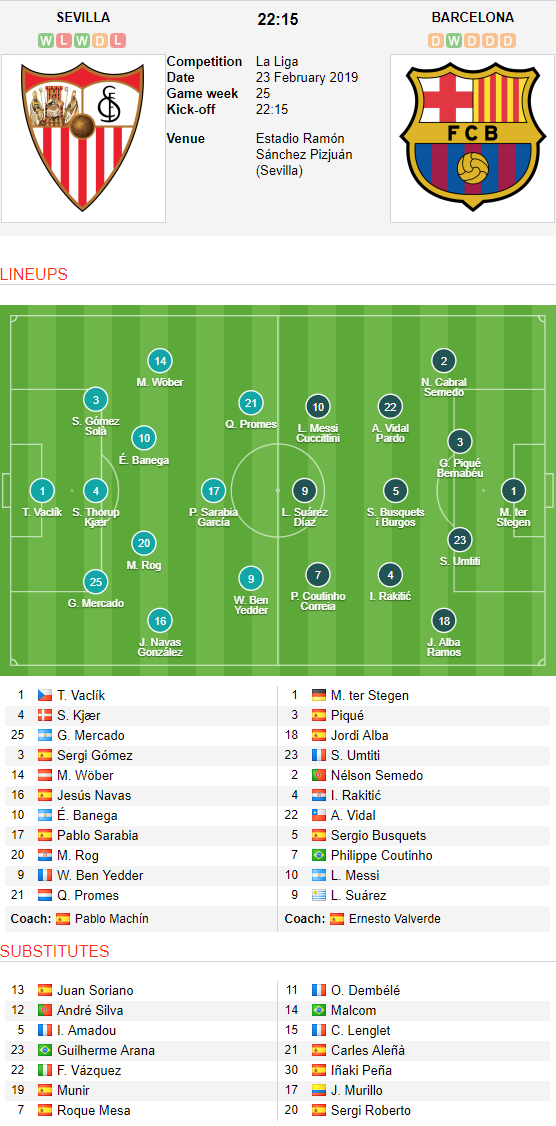 AEGoal.net cập nhật chính xác ĐỘI HÌNH RA SÂN trận Sevilla vs Barcelona diễn ra lúc 22h15 ngày 23/2 trong khuôn khổ Vòng 26 - VĐQG Tây Ban Nha