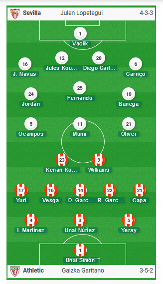 * Bilbao (5-3-2): Unai Simon; Ander Capa, Unai Nunez, Yeray Alvarez, Inigo Martinez, Yuri; Raul Garcia, Unai Lopez, Dani Garcia; Inaki Williams, Inigo Cordoba.