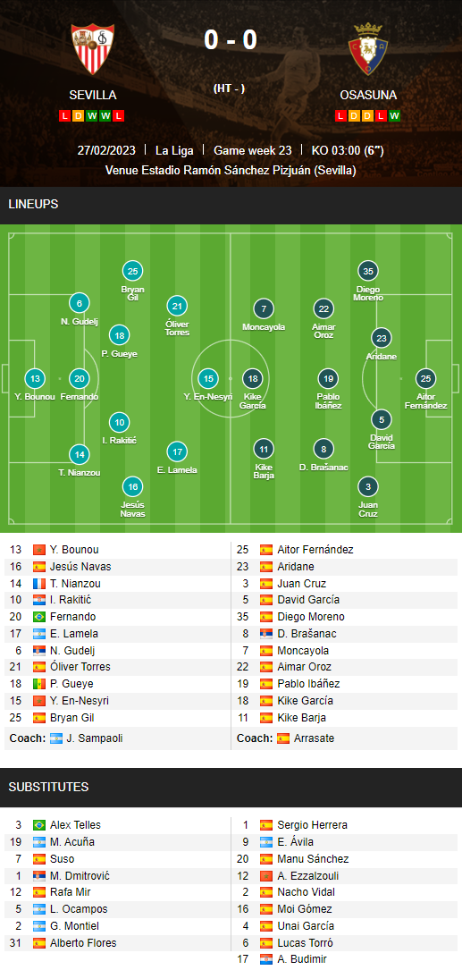 AEGoal cập nhật chính xác ĐỘI HÌNH RA SÂN trận Sevilla vs Osasuna diễn ra lúc 03h00 ngày 27/02/2023 trong khuôn khổ giải VĐQG Tây Ban Nha.