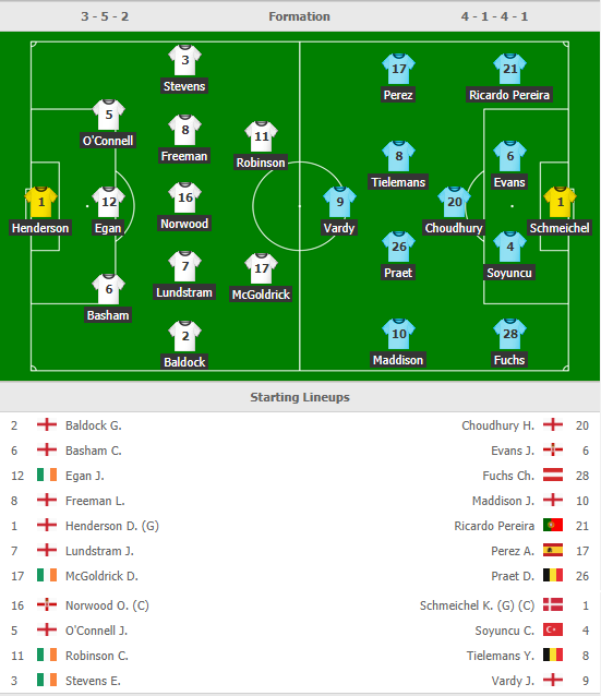 AEGoal.net cập nhật chính xác ĐỘI HÌNH RA SÂN trận Sheffield United vs Leicester City diễn ra lúc 21h00 ngày 24/8 trong khuôn khổ vòng 3 - Ngoại hạng Anh.