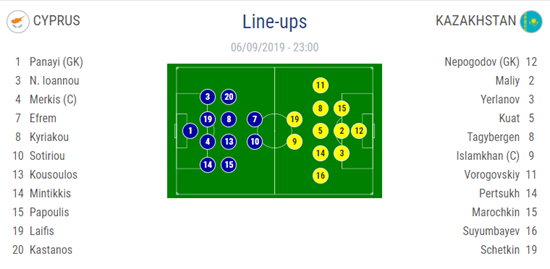 AEGoal.net cập nhật chính xác ĐỘI HÌNH RA SÂN trận Síp vs Kazakhstan diễn ra lúc 23h00 ngày 06/9 trong khuôn khổ vòng loại Euro 2020.