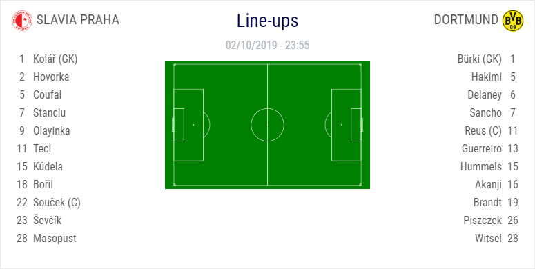 AEGoal.net cập nhật chính xác ĐỘI HÌNH RA SÂN trận Slavia Praha vs Dortmund diễn ra lúc 23h55 ngày 02/10 trong khuôn khổ Vòng bảng UEFA Champions League.