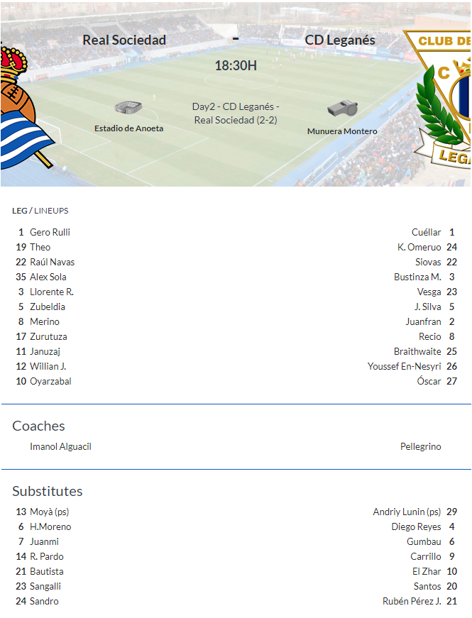 AEGoal.net cập nhật chính xác ĐỘI HÌNH RA SÂN trận Sociedad vs Leganes diễn ra lúc 0h30 ngày 17/02 trong khuôn khổ vòng 24 giải VĐQG Tây Ban Nha.