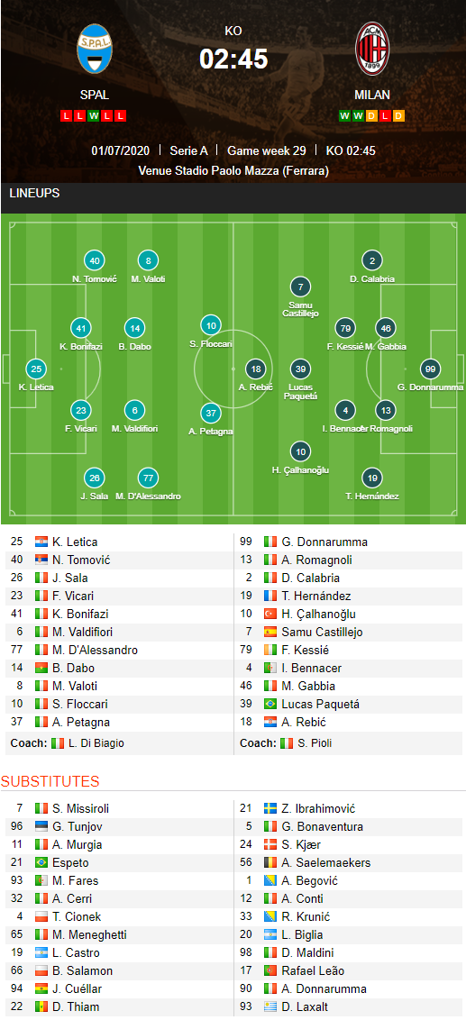 ĐỘI HÌNH RA SÂN trận Spal vs AC Milan, 02h45 ngày 02/07: VĐQG Italia