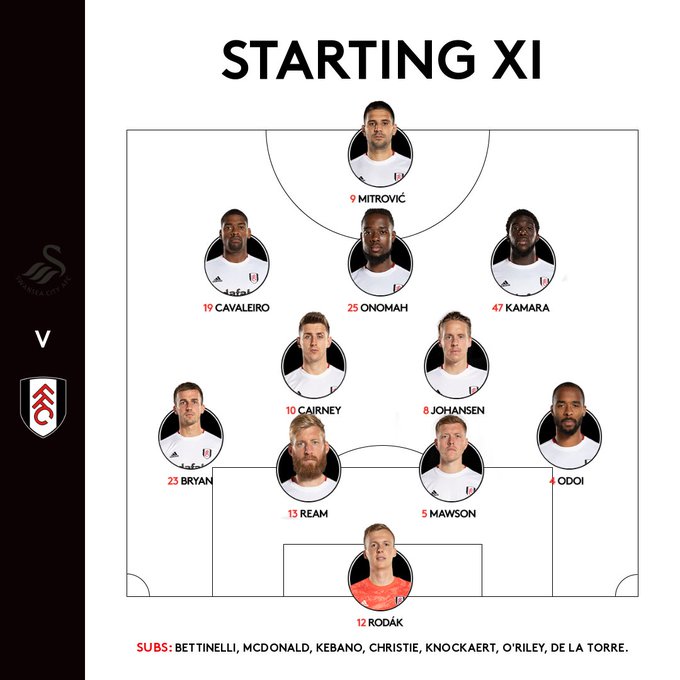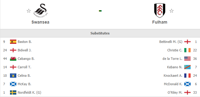 AEGoal.net cập nhật chính xác ĐỘI HÌNH RA SÂN trận Swansea vs Fulham diễn ra lúc 02h45 ngày 30/11 trong khuôn khổ vòng 19 giải Hạng nhất Anh.