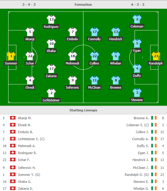 * Thụy Sĩ (3-4-2-1): Sommer; Elvedi, Schar, Akanji; Mbabu, Zakaria, Xhaka, Rodriguez; Mehmedi, Embolo; Seferovic.