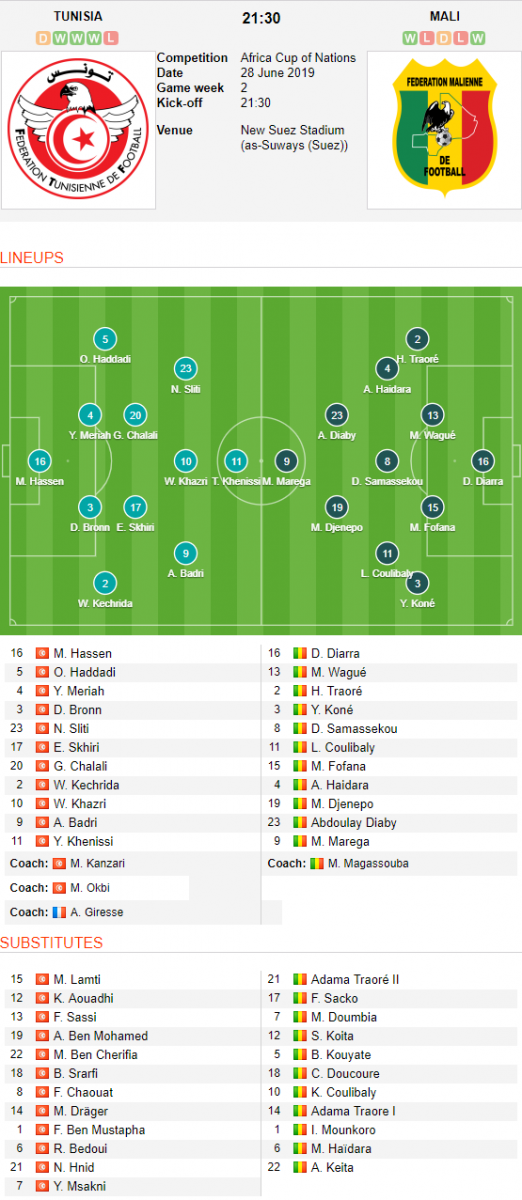 AEGoal.net cập nhật chính xác ĐỘI HÌNH RA SÂN trận Tunisia vs Mali diễn ra lúc 21h30 ngày 28/6 trong khuôn khổ Bảng E - CAN Cup 2019.