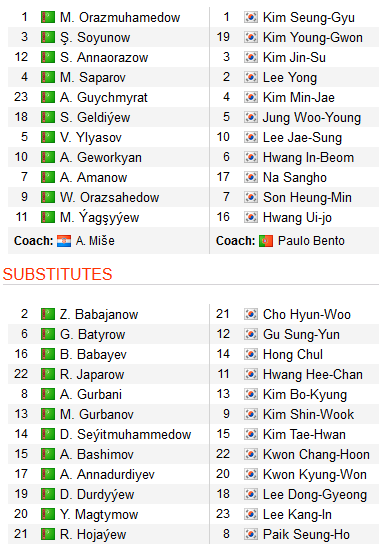 Hàn Quốc: Kim Seung-gyu; Kim Young-gwon, Lee Yong, Kim Jin-su, Hong Chul; Lee Jae-sung, Jung Woo-young, Kim Bo-kyung; Son Heung-min, Kim Shin-wook, Hwang Ui-jo