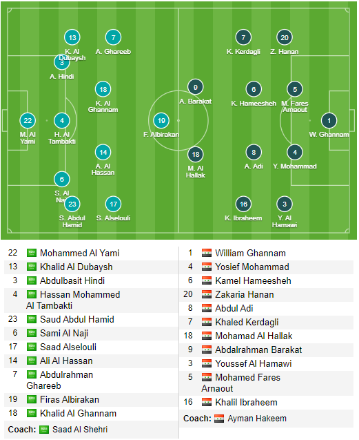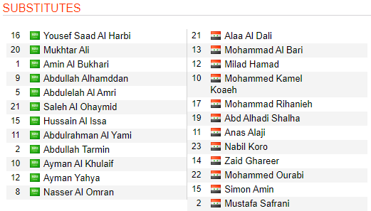 * U23 Saudi Arabia: Al Yami, A.Hindi, Al Tambakti, Al Amri, Al Dubaysh, Abdul Hamid, A.Ghareeb, M.Ali, Al Omran, Al Khulaif, Alhamddan