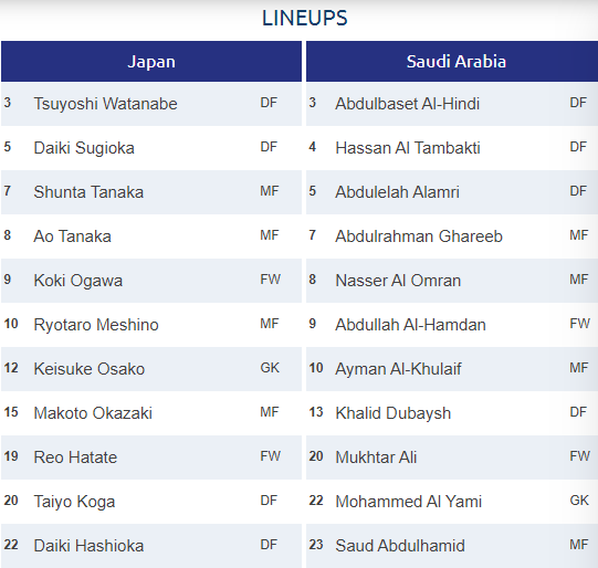 AEGoal.net cập nhật chính xác ĐỘI HÌNH RA SÂN trận U23 Nhật Bản vs U23 Ả Rập Saudi diễn ra lúc 20h15 ngày 09/01 trong khuôn khổ VCK U23 châu Á.