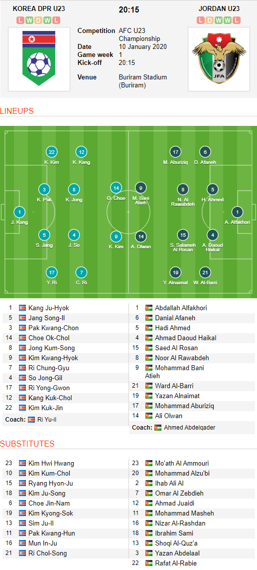ĐỘI HÌNH RA SÂN trận U23 Triều Tiên vs U23 Jordan, 20h15 ngày 10/01: VCK U23 châu Á