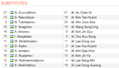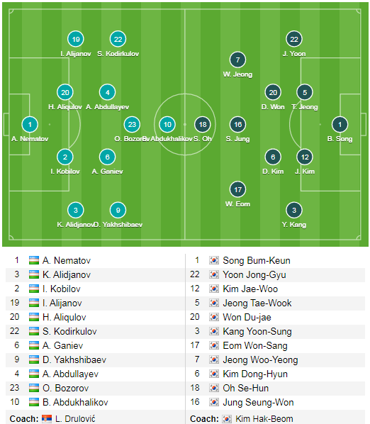 AEGoal.net cập nhật chính xác ĐỘI HÌNH RA SÂN trận U23 Uzbekistan vs U23 Hàn Quốc diễn ra lúc 17h15 ngày 15/01 trong khuôn khổ VCK U23 Châu Á.