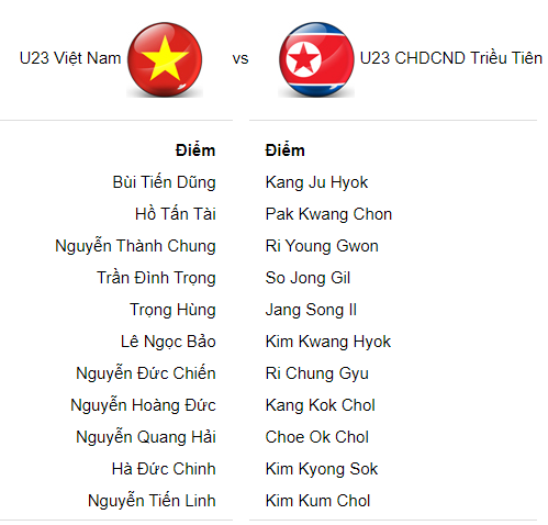 * U23 Việt Nam: Tiến Dũng; Tấn Tài, Việt Anh, Ngọc Bảo, Thành Chung, Thanh Thịnh, Đức Chiến, Thanh Sơn, Hoàng Đức, Quang Hải, Tiến Linh.