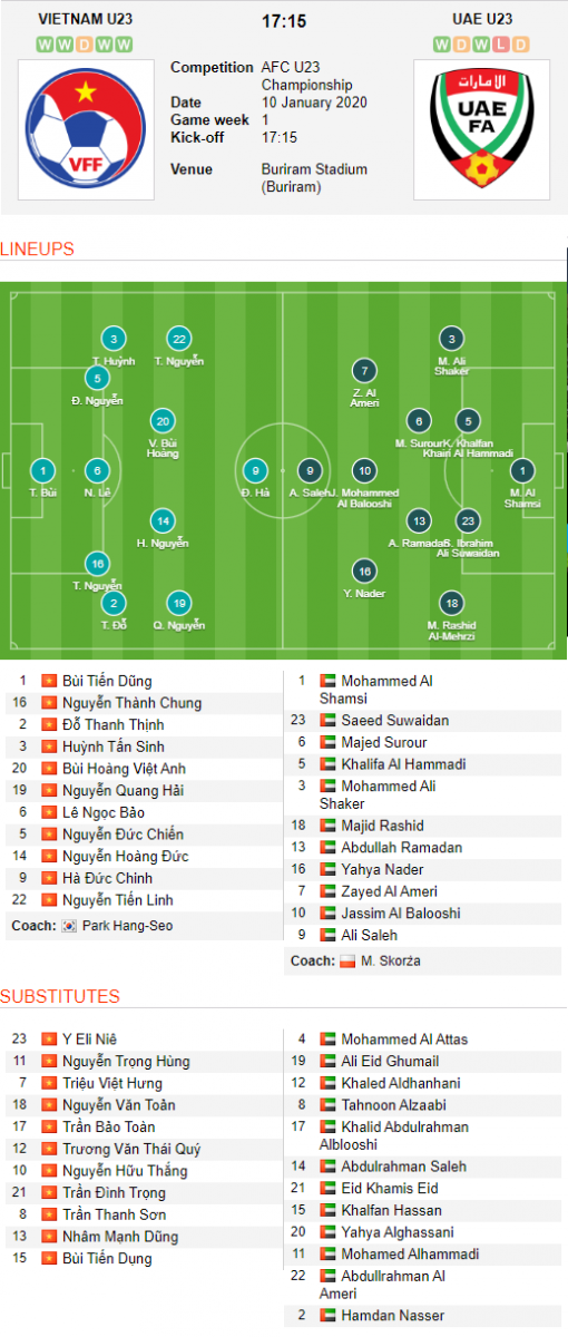 AEGoal.net cập nhật chính xác ĐỘI HÌNH RA SÂN trận U23 Việt Nam vs U23 UAE diễn ra lúc 17h15 ngày 10/01 trong khuôn khổ VCK U23 châu Á.