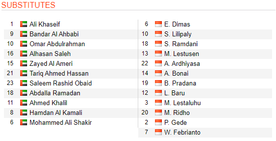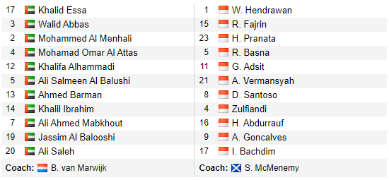 * UEA (4-3-3): Khalid Elsa - Mohamed Al Menhali, Khalifa Alhammadi, Mohamed Omar Al Attas, Walid Abbas - Ahmed Barman, Jassim Salman, Omar Abdulrahman - Khalil Al Hammadi, Ali Saleh - Ahmed Khalil