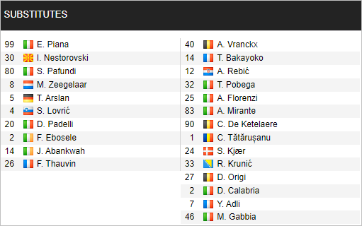 * Danh sách dự bị trận Udinese vs AC Milan (02h45 ngày 18/3)