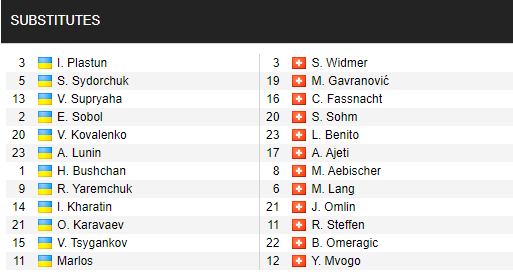 * Danh sách dự bị trận Ukraine vs Thụy Sỹ, 01h45 ngày 04/9: UEFA Nations League