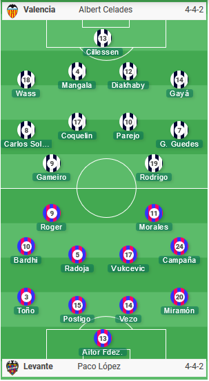 AEGoal.net cập nhật chính xác ĐỘI HÌNH RA SÂN trận Valencia vs Levante diễn ra lúc 03h00 ngày 13/06 trong khuôn khổ Vòng 28 - VĐQG Tây Ban Nha.