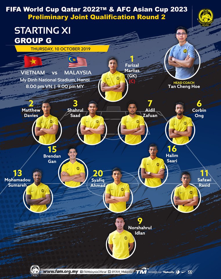 Malaysia (4-2-3-1): Marlias - M.Davies, Nor Azlin, Sharul Saad, Corbin-Ong - Brendan Gan, Mahinan - Sumareh, Syafiq Ahmad, Safawi Rasid - Talaha